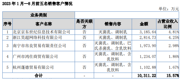 重押电子商务平台,为百菲乳业带来了可观收入。2021、2022年、2023年前8月,京东、天猫这两家头部电子商务平台,均位列百菲乳业的前五大客户。2023年前8月,京东、天猫就为其贡献了约6000万元收入,在总营收的占比接近一成。