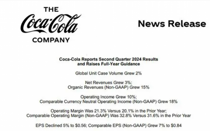 虽然增收不增利,但在二季度财报中,可口可乐仍再一次上调了2024年全年成绩指引,估计2024年全年有机营收增速为9%至10%,高于此前估计的8%至9%。