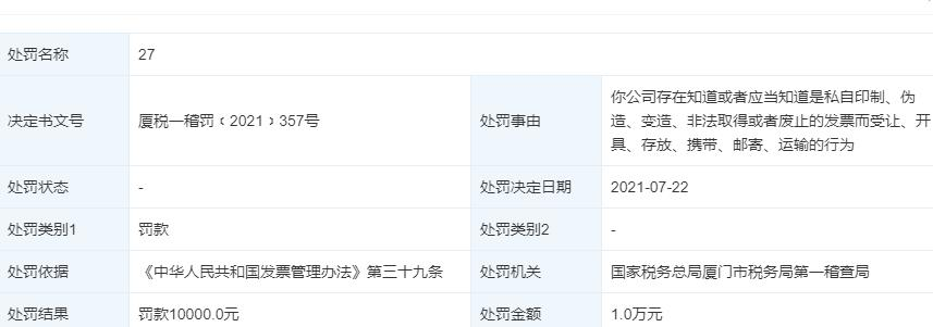 据行政处罚文书厦税一稽罚﹝2021﹞357号显现,企业存在知道或许应当知道是私自印制、假造、变造、不合法获得或许废止的发票而受让、开具、寄存、带着、邮递、运送的行为,国家税务总局厦门市税务局榜首稽查局根据《中华人民共和国发票管理办法》第三十九条于2021年7月22日对其罚款1万元。