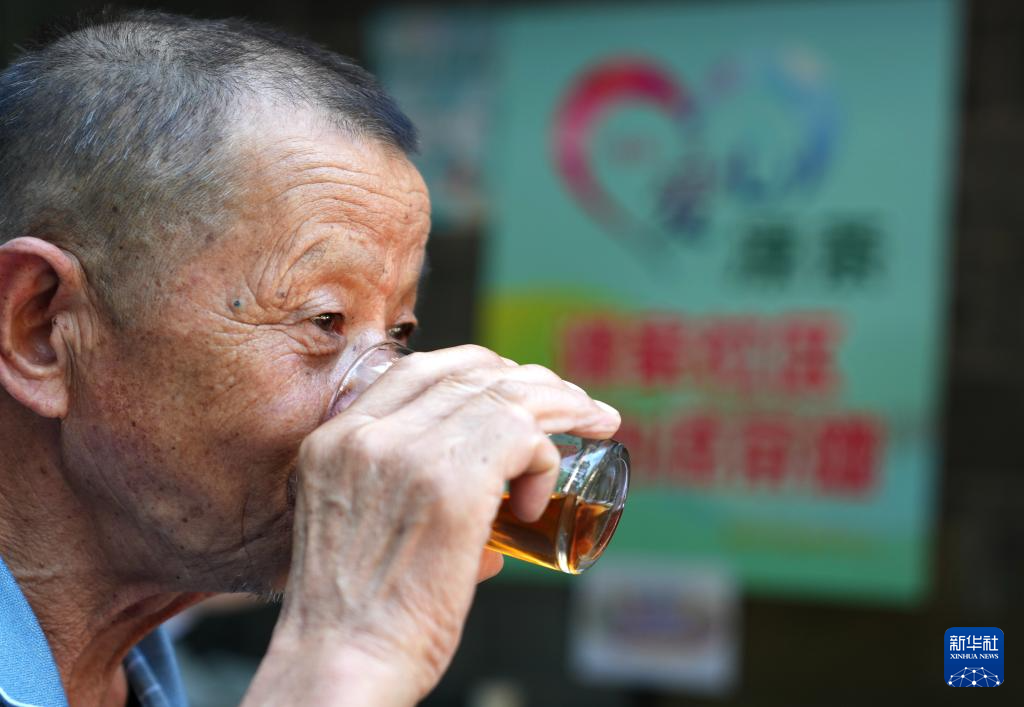 7月7日,社区居民在杭州濮家社区爱心凉茶摊喝凉茶。