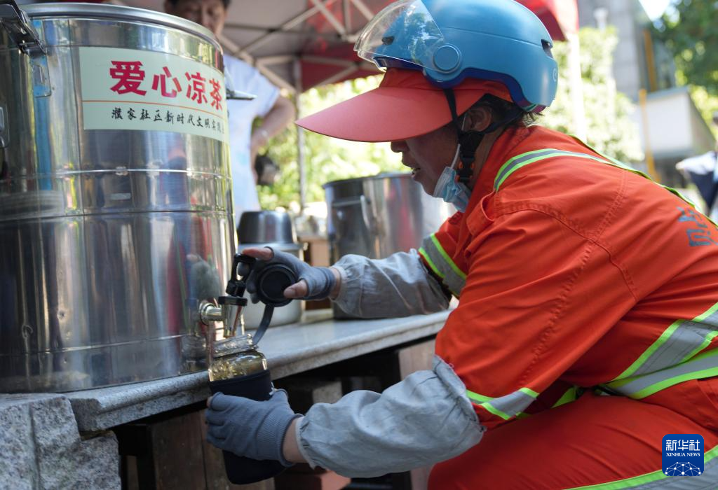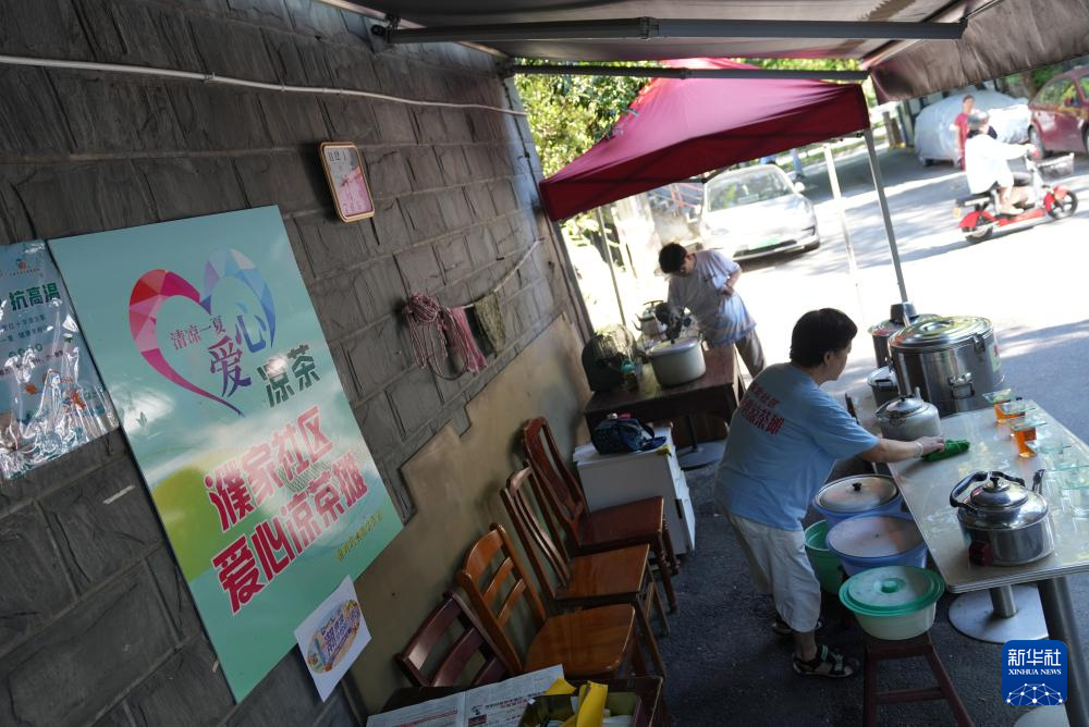 近来,浙江杭州继续晴热高温,杭州市上城区闸弄口大街濮家社区爱心凉茶摊出摊,为社区居民和周边的野外劳动者免费供给凉茶避暑。