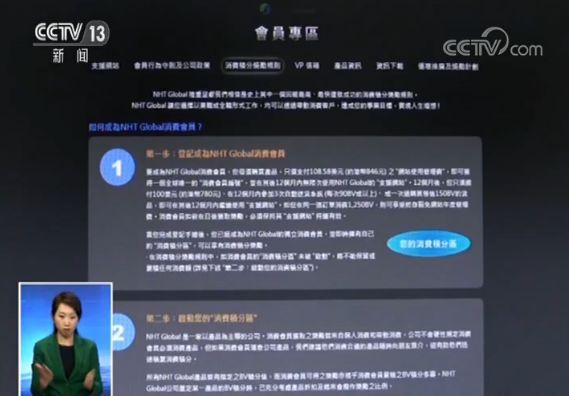 然健环球公司资深会员周女士:“我们这样的平台是叫NHT Global,natural health trend自然健康趋势,它到中国的名字叫然健环球,是一个全球会员积分制的网上超市,它属于复合电子商务。我们所有吃的东西全部是国外进口,这个(诺丽果汁)是属于膳食补充剂,这个是香港网站(销售)的。”